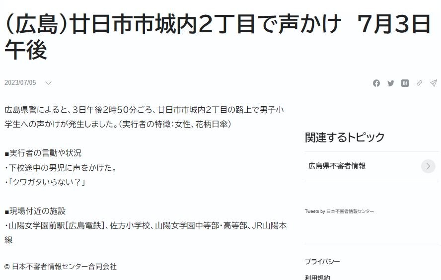 (広島)廿日市市城内2丁目で声かけ 7月3日午後
