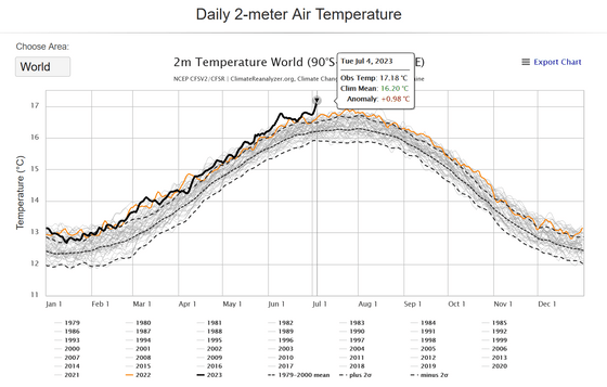 季節のサイクル、エルニーニョ現象、地球温暖化の三重苦により、2023年7月4日における地球の平均気温が17.18度に達し、記録が始まった1979年以来で最も暑い日となっていたことがわかりました。気象学者は、科学的な分析により得られたデータから、過去12万5000年間の中でも飛び抜けて暑い日だったと推測しており、迅速に気候変動を食い止めなければ今後も記録が塗り替えられ続けるだろうと指摘しています。