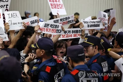 到着予定時間より1時間余り前の午後9時30分ごろから、革新系野党・正義党のイ・ヒョンジョン副代表や進歩党、全国民主労働組合総連盟(民主労総)のほか、複数の市民団体50人余りがIAEA報告書を糾弾するデモを開始した。