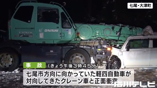 7日午後3時45分ごろ、七尾市大津町の県道で志賀町方面から七尾市方面に向かっていた軽四自動車が対向してきた、クレーン車と正面衝突しました。