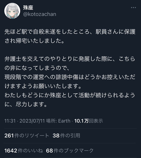 【悲報】VTuberさん、運営と喧嘩して自殺未遂をしてしまうwwwwwwwwwwwwwwwwwwwww Twitter Facebook はてブ LINE コピー 2023.07.11 スポンサーリンク 1:以下、?ちゃんねるからVIPがお送りします:2023/07/11(火) 14:27:31.810 ID:SIKx7ZlVd.net 2:以下、?ちゃんねるからVIPがお送りします:2023/07/11(火) 14:28:21.434 ID:MPeyq1D50.net 自殺未遂したのはこの絵の声優だろ 4:以下、?ちゃんねるからVIPがお送りします:2023/07/11(火) 14:28:42.126 ID:iYE+8mJ9a.net 命軽そう 6:以下、?ちゃんねるからVIPがお送りします:2023/07/11(火) 14:29:52.218 ID:HabpbHFHa.net いやなんの報告だよ 続きを読む
