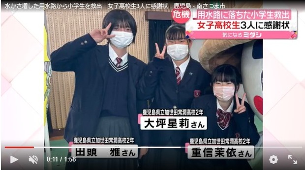 用水路から出られなくなった小学生を助け出したとして、女子高校生3人に感謝状が贈られました。
