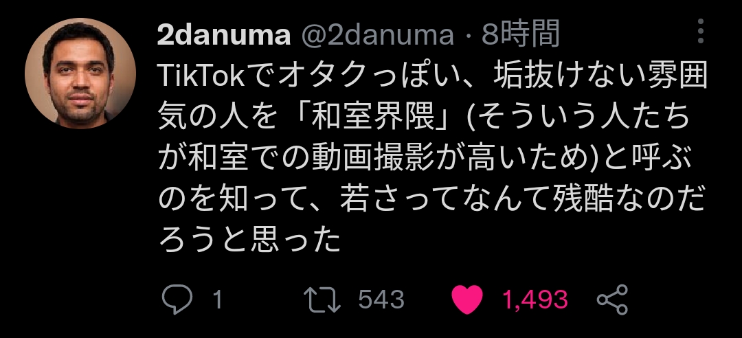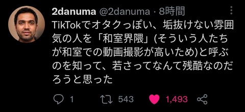 【悲報】TikTok界における女版チー牛の呼称は「和室界隈」らしい… Twitter Facebook はてブ LINE コピー 2022.02.08 スポンサーリンク 1:風吹けば名無し:2022/02/08(火) 18:18:56.29 ID:YeBnHSrxM.net 2:風吹けば名無し:2022/02/08(火) 18:19:01.19 ID:YeBnHSrxM.net 17:風吹けば名無し:2022/02/08(火) 18:20:36.49 ID:FahO6t600.net >>2 二枚目は良い感じの廊下で草 55:風吹けば名無し:2022/02/08(火) 18:27:19.96 ID:+sQ8TKhWM.net >>2 4枚目の納得感 続きを読む