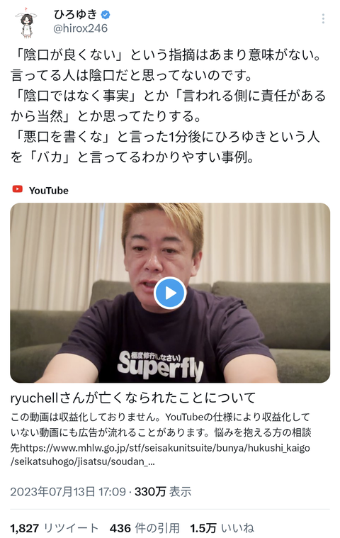 また、「2ちゃんねるみたいなクソなメディアを作ったバカもいるけどさ、ああいうモノを作ったことを自体、それを肯定するような言説も僕は許せない」と、自身と因縁のある「ひろゆき」こと西村博之氏が開設した掲示板サイトも批判した。