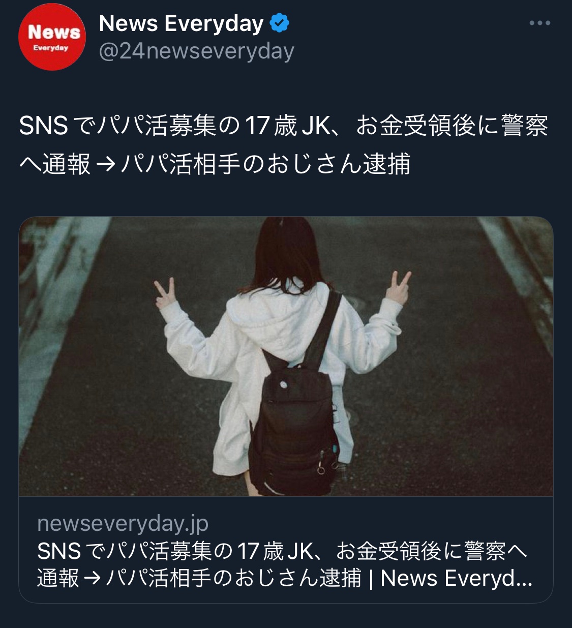 SNSでパパ活募集の17歳JK、お金受領後に警察へ通報→パパ活相手のおじさん逮捕 https://t.co/YxkenavAZr