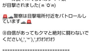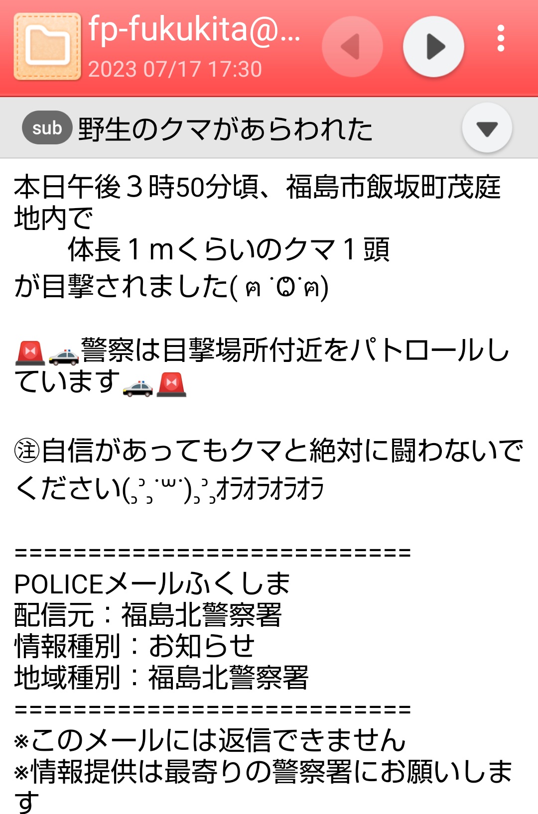 福島のクマ出現のメール緊張感無さすぎて草 Twitter Facebook はてブ LINE コピー 2023.07.19 スポンサーリンク 1: 名無しさん@おーぷん 23/07/19(水) 08:47:29 ID:LHU4 ほんまに注意喚起する気あんのか 注が🤣🤣🤣 pic.twitter.com/JHev9zZICT— よした (@ta22_yos) July 17, 2023 2: 名無しさん@おーぷん 23/07/19(水) 08:47:55 ID:MDre かわいい 3: 名無しさん@おーぷん 23/07/19(水) 08:47:57 ID:XWGN また役場の近くに出たんか? 続きを読む