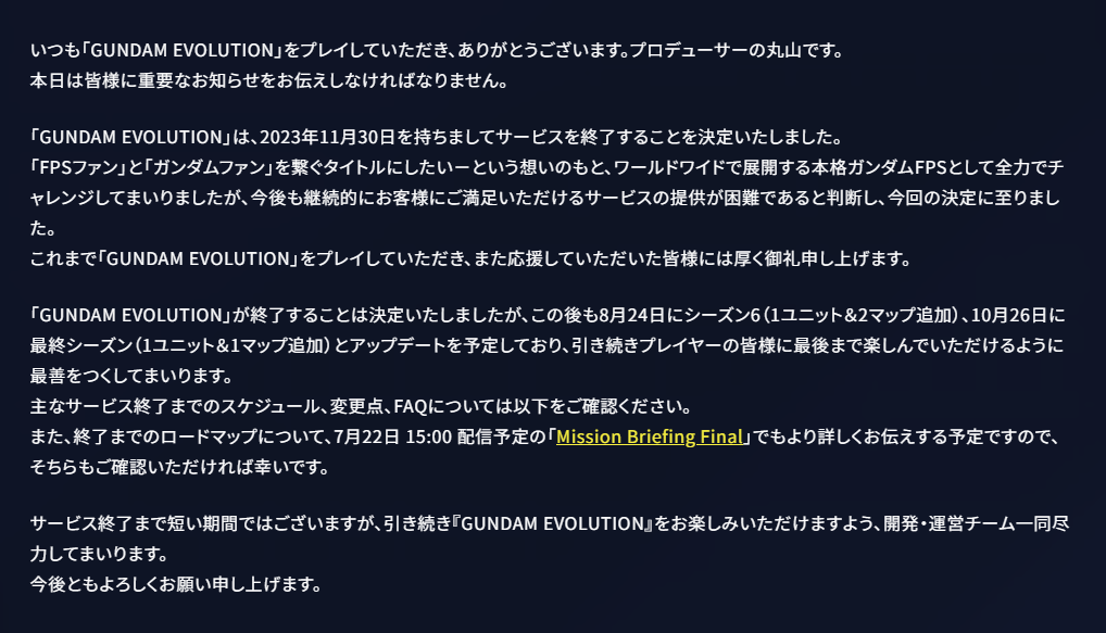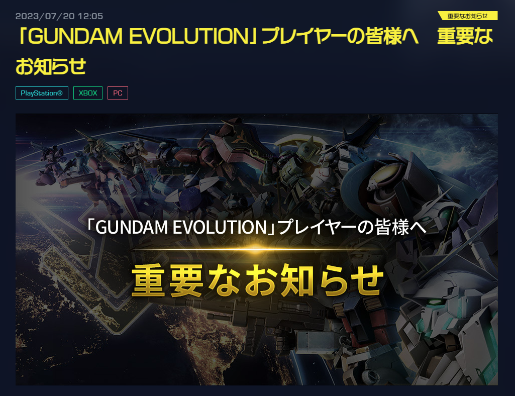 「GUNDAM EVOLUTION」に関する重要なお知らせがございます。