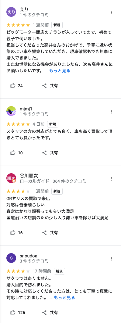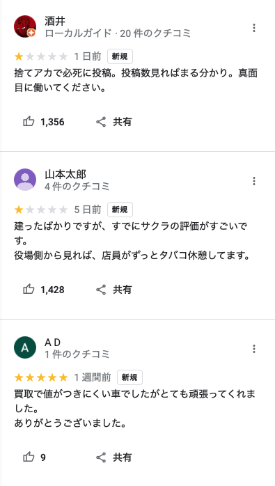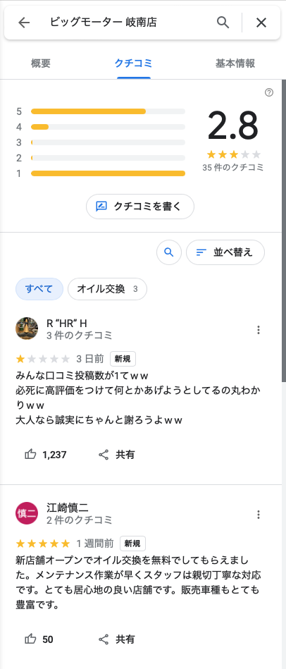 【悲報】最近オープンした「ビッグモーター 岐南店」Google口コミでバトル中 Twitter Facebook はてブ LINE コピー 2023.07.20 スポンサーリンク 1:以下、?ちゃんねるからVIPがお送りします:2023/07/20(木) 17:24:51.124 https://goo.gl/maps/i1EBwEYLYACdkHFf6 2:以下、?ちゃんねるからVIPがお送りします:2023/07/20(木) 17:25:22.782 3:以下、?ちゃんねるからVIPがお送りします:2023/07/20(木) 17:25:51.403 4:以下、?ちゃんねるからVIPがお送りします:2023/07/20(木) 17:27:28.053 こんな草の根活動しても手遅れだろWWW 続きを読む