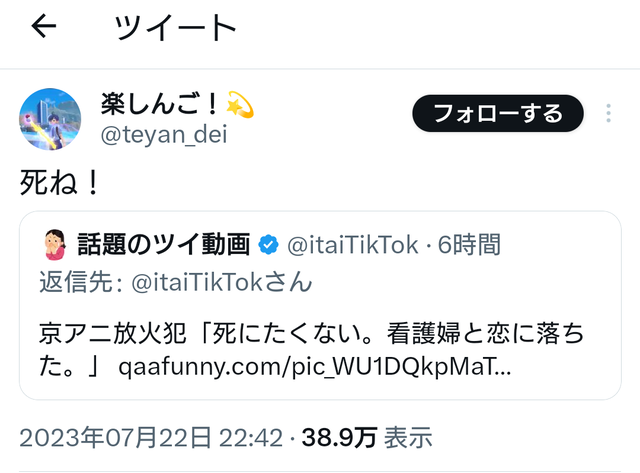 京アニ放火犯「死にたくない…看護婦を好きになった😭」楽しんご「…」 Twitter Facebook はてブ LINE コピー 2023.07.23 スポンサーリンク 1: それでも動く名無し 2023/07/23(日) 05:43:10.27 ID:wVLh7vLq0 草 知人が統合失調症になるまでの経過を見たので書いていく 続きを読む