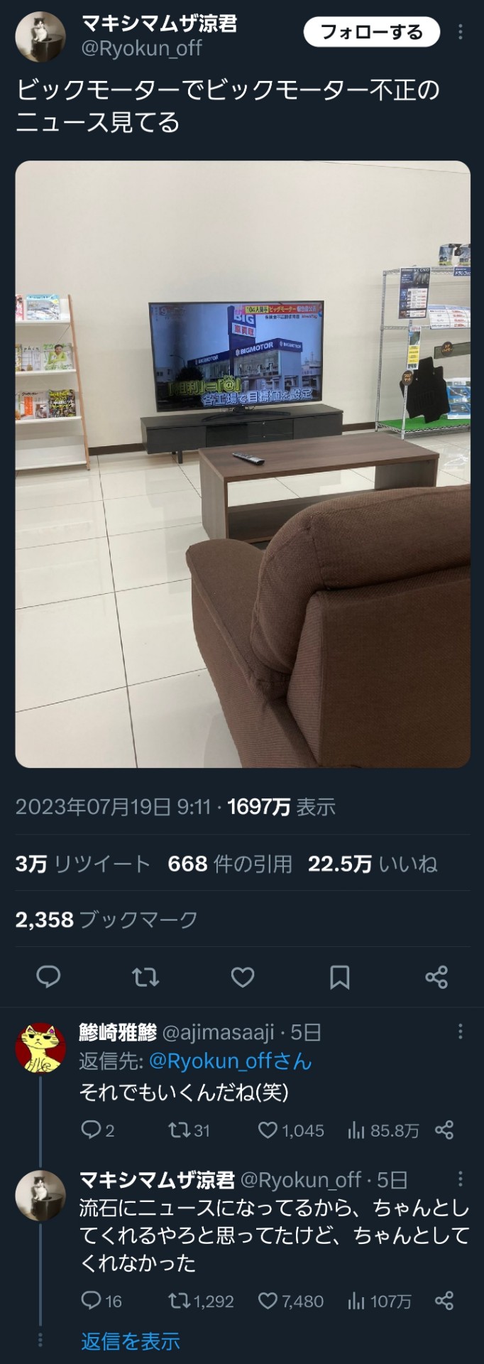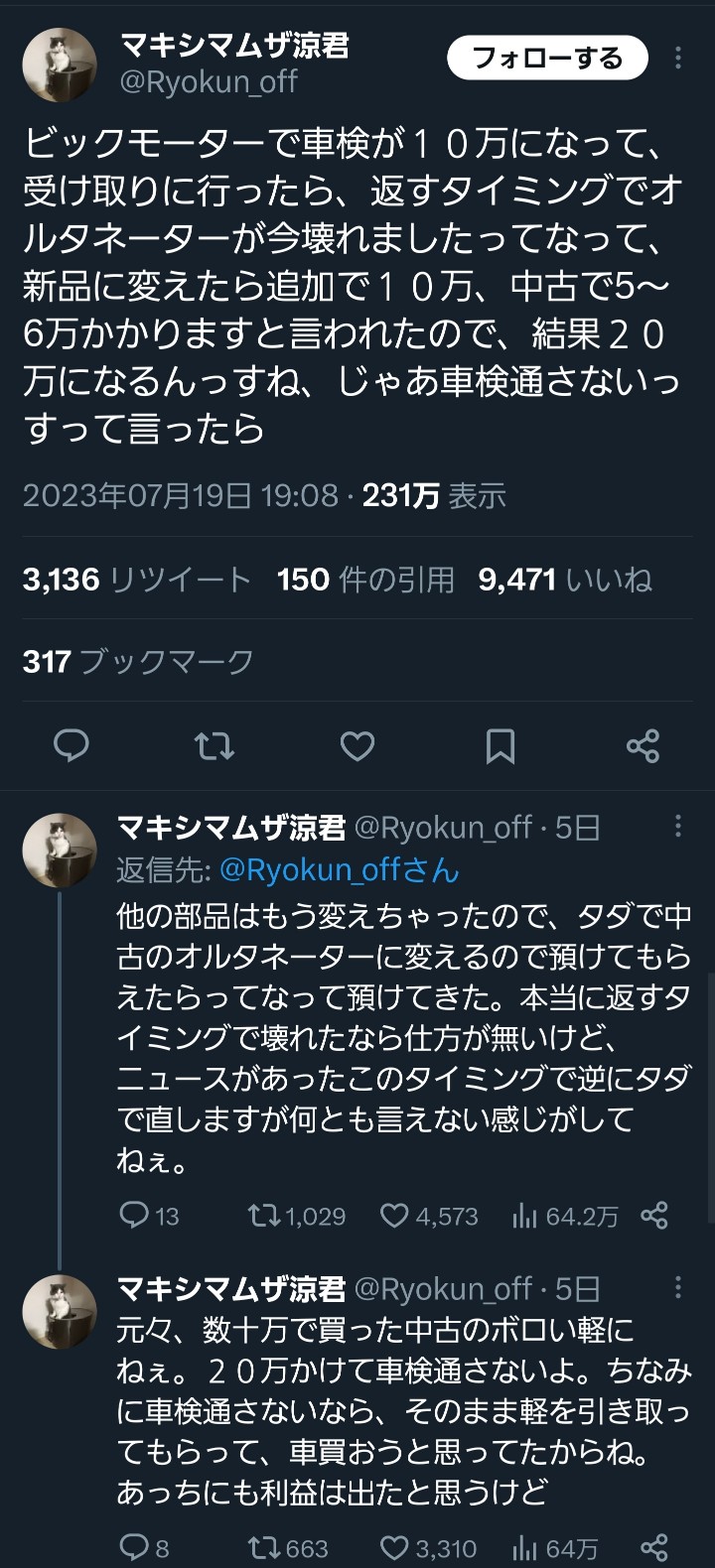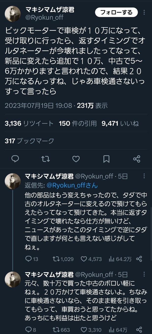 【悲報】逆張りでビッグモーターに行ったひと、案の定ボッタクリされる Twitter Facebook はてブ LINE コピー 2023.07.25 スポンサーリンク 1:2023/07/25(火) 13:03:39.77 ID:ieVotM/v0転載元スレッド:https://eagle.5ch.net/test/read.cgi/livejupiter/1690257819/ 続きを読む