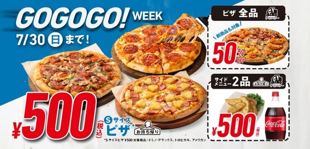 ピザチェーン「ドミノ・ピザ」が21日から10日間限定で行っている割引キャンペーン「GoGoGo!ピザウィーク」が「とんでもない割引率」と驚きの声が上がっています。人気メニューのドミノ・デラックス(通常Sサイズ2480円)と、トロピカル、アメリカン(各2290円)が持ち帰り限定で、500円になる企画。