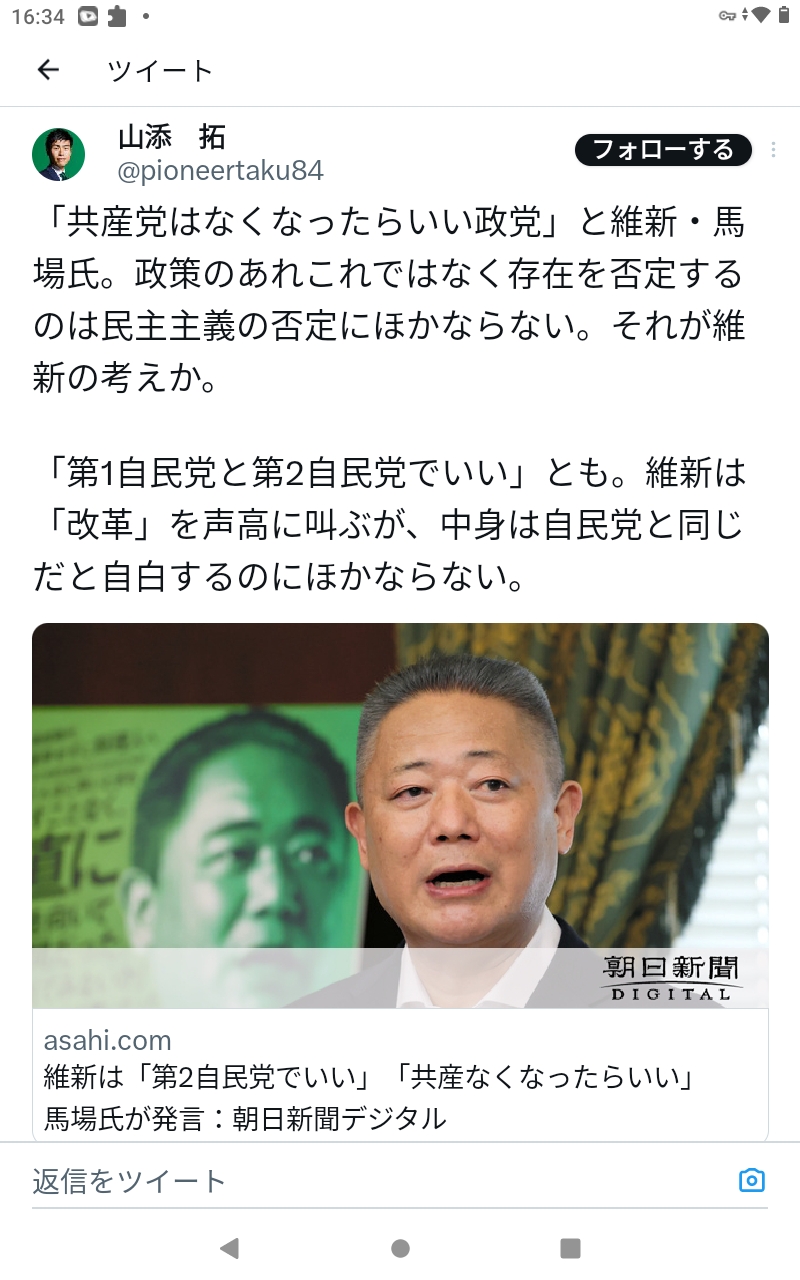 「共産党はなくなったらいい政党」と維新・馬場氏。政策のあれこれではなく存在を否定するのは民主主義の否定にほかならない。それが維新の考えか。