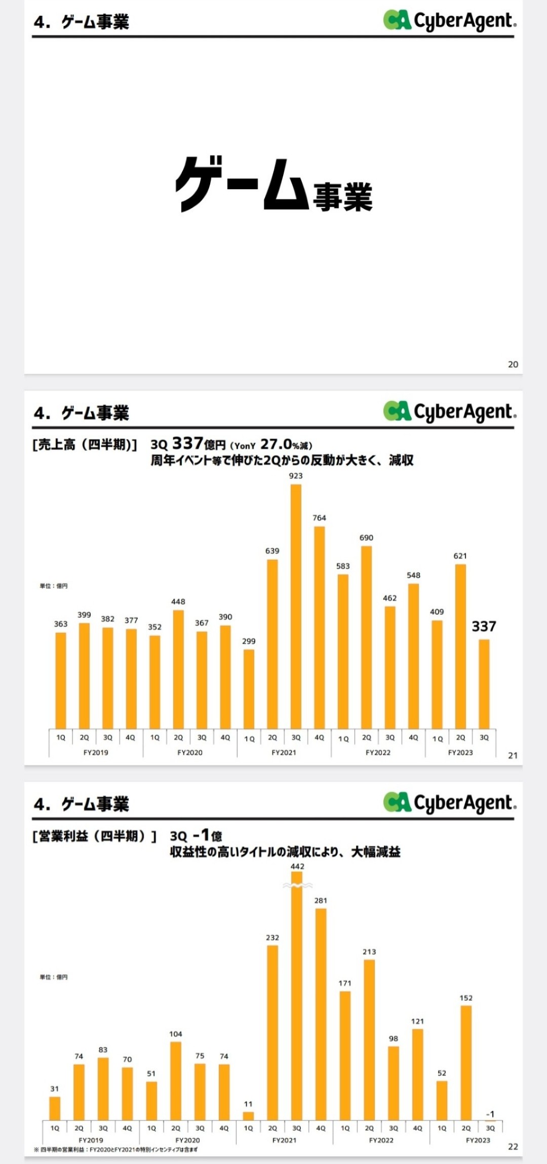 サイバーエージェントの第3四半期決算(23年4~6月)。ゲーム事業が営業赤字で、3月にウマ娘でシナリオリンク後出しで三女神サポカを実装したことへの反発もかなり影響してそう。凱旋門賞シナリオでどうなるんですかね