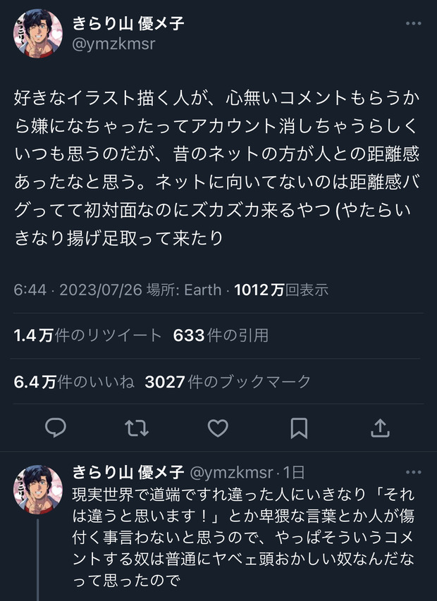 好きなイラスト描く人が、心無いコメントもらうから嫌になちゃったってアカウント消しちゃうらしく
