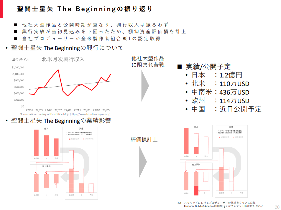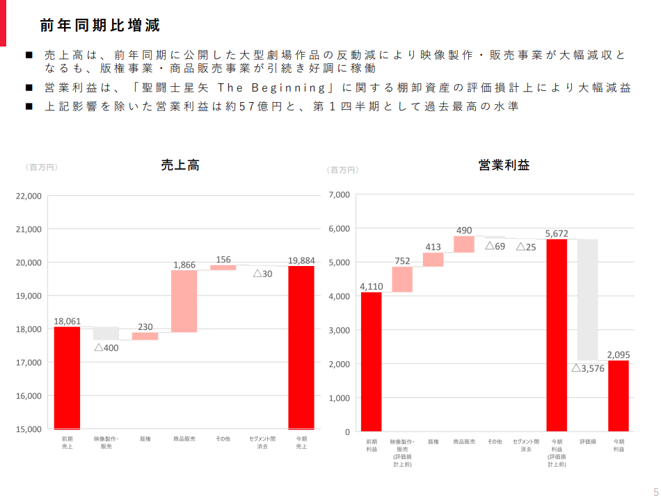 一方、利益面については、「聖闘士星矢 The Beginning」に関する棚卸資産の評価損を計上し、各利益項目とも2ケタ超の大幅減益となった。