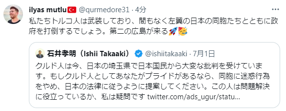 日本人男性「クルド人の皆さんへ。日本の法律に従ってくださいね」クルド人「…」 Twitter Facebook はてブ LINE コピー 2023.07.31 スポンサーリンク 1:2023/07/31(月) 14:29:56.95 ID:L2r43UBe0【話題】『私たちトルコ人は武装しており、間もなく左翼の日本の同胞たちとともに政府を打倒するでしょう。第二の広島が来る』 | Share News Japanhttps://sn-jp.com/archives/133438転載元スレッド:https://eagle.5ch.net/test/read.cgi/livejupiter/1690781396/ 続きを読む