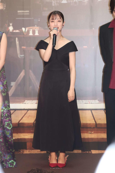 橋本は胸元ザックリの黒いオフショルダードレスで登場し、視線を釘付け。発光するような白い肌に大人の色香を漂わせ、おじぎすると、無数のフラッシュを浴びた。