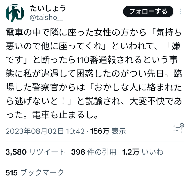 電車の中で隣に座った女性の方から「気持ち悪いので他に座ってくれ」といわれて、「嫌です」と断ったら110番通報されるという事態に私が遭遇して困惑したのがつい先日。臨場した警察官からは「おかしな人に絡まれたら逃げないと!」と説諭され、大変不快であった。電車も止まるし。