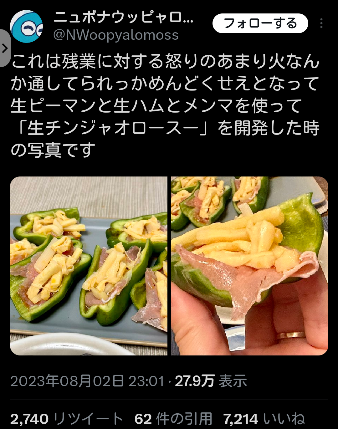 これは残業に対する怒りのあまり火なんか通してられっかめんどくせえとなって生ピーマンと生ハムとメンマを使って「生チンジャオロースー」を開発した時の写真です pic.twitter.com/eRam71DTQ8
