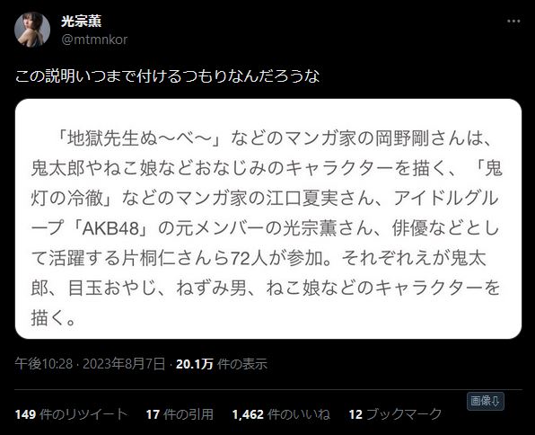 【闇深】元AKB48で現在画家の光宗薫(30歳)「元AKBと紹介するのやめて。不快。私はアーティスト」 Twitter Facebook はてブ LINE コピー 2023.08.08 スポンサーリンク 1: クトニオバクター(大台ヶ原山) (8級) [ニダ] 2023/08/08(火) 08:04:51.53 ● BE:801948679-2BP(2000) ツイート画像 光宗薫 元AKB48 現在は絵画アーティスト 光宗薫のアート作品 https://www.instagram.com/mtmnkor.art/ 【速報】ビッグモーター副社長・宏一くんのゴルフ動画流出wwwww 続きを読む
