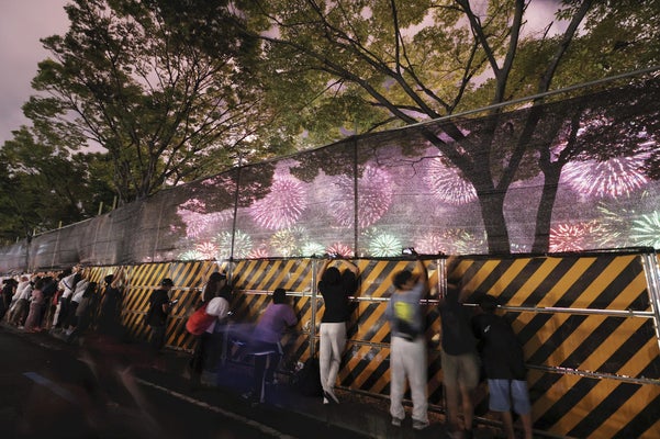 4年ぶり「びわ湖大花火大会」、目隠しフェンスの隙間からスマホで撮影する姿