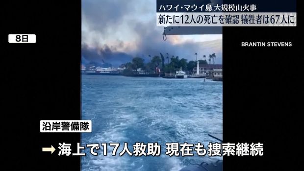 マウイ島の山火事では繁華街のラハイナに壊滅的な被害がでていて、まだ鎮火には至っていません。地元当局は11日、新たに12人の死亡を確認し、犠牲者はこれで67人となりました。