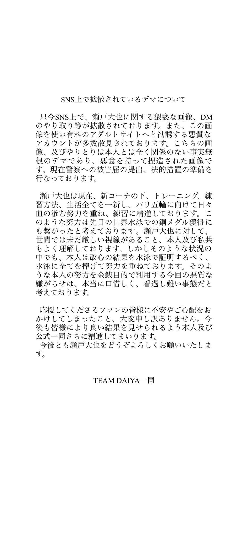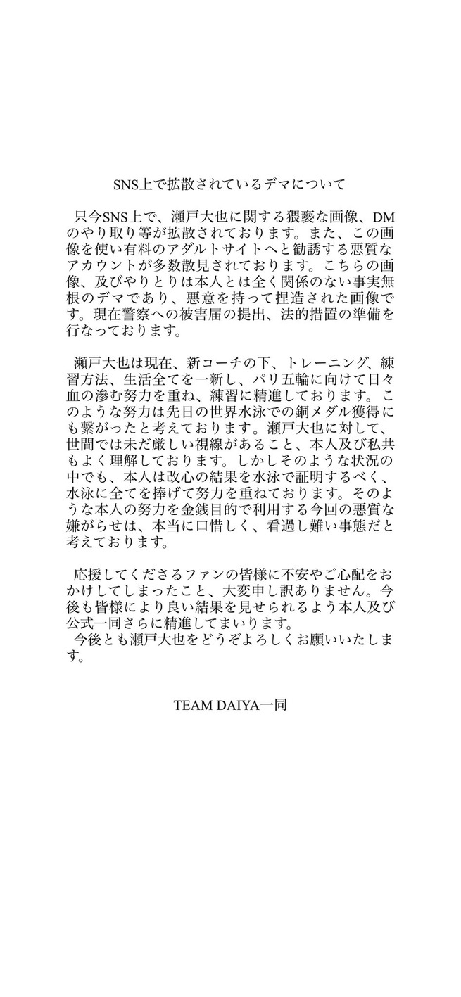 公式Xでは「SNS上で拡散されているデマについて」というタイトルで文書を掲載。「只今SNS上で、瀬戸大也に関する猥褻な画像、DMのやり取り等が拡散されております。また、この画像を使い有料のアダルトサイトへと勧誘する悪質なアカウントが多数散見されております。こちらの画像、及びやりとりは本人とは全く関係のない事実無根のデマであり、悪意を持って捏造された画像です。現在警察への夜害届の提出、法的措置の準備を行なっております」と警告した。