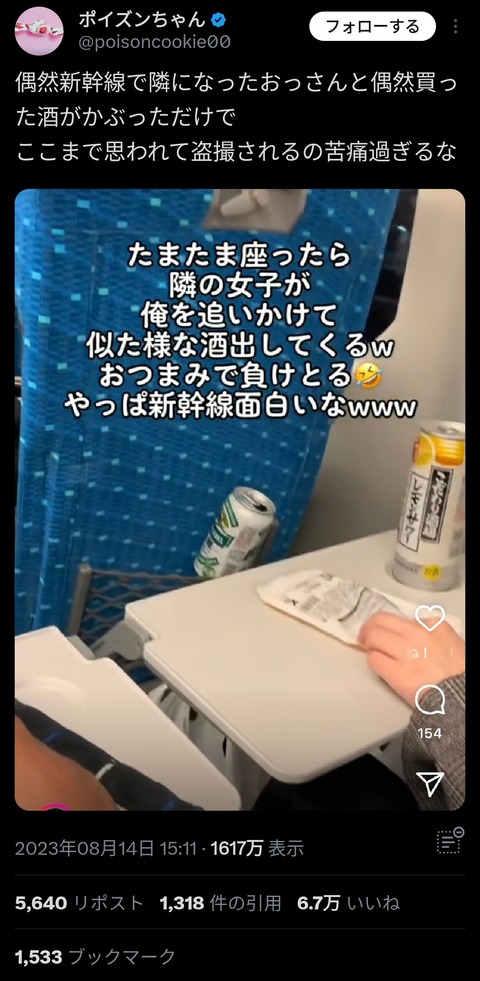 【悲報】弱男おじ「新幹線で隣の若い女が俺の真似して酒飲んでるwおもしれー女w」パシャッ 女性「……」 Twitter Facebook はてブ LINE コピー 2023.08.15 スポンサーリンク 1:それでも動く名無し:2023/08/15(火) 03:34:15.89 ID:prmItaGqr.net 2:それでも動く名無し:2023/08/15(火) 03:35:50.84 ID:/frx+KQkr.net やーばいでしょ… 3:それでも動く名無し:2023/08/15(火) 03:35:57.64 ID:C+5FI9u80.net うせやろこれ… 続きを読む