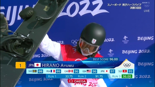 1、2本目でトリプルコーク1440を決めていた🇯🇵#平野歩夢 選手は、3本目もオンリーワンの得意技を決め、圧巻のランを完遂。96.00で🥇金メダル獲得です。#Beijing2022 #gorinjp