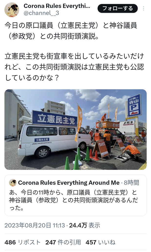 【速報】立憲民主党、参政党と手を組むwwwwww Twitter Facebook はてブ LINE コピー 2023.08.20 スポンサーリンク 1:2023/08/20(日) 18:51:02.30 ID:U1ynawqS0反ワク連合らしい転載元スレッド:https://nova.5ch.net/test/read.cgi/livegalileo/1692525062/ 続きを読む
