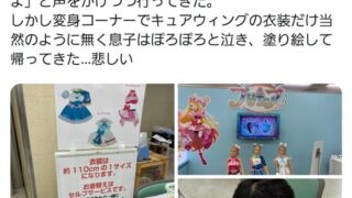 しかし変身コーナーでキュアウィングの衣装だけ当然のように無く息子はぽろぽろと泣き、塗り絵して帰ってきた…悲しい