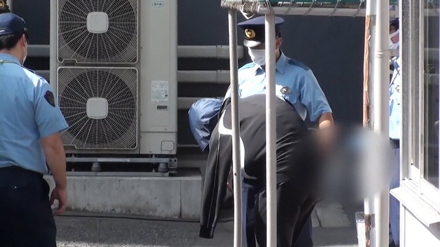 背中を丸め、うつむいたまま警察署の階段を下りる男。