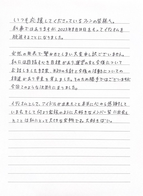 いつも応援してくださっているファンの皆様へ。突然の発表で驚かせてしまい申し訳ございません。長文ですが読んで頂けたら嬉しいです。