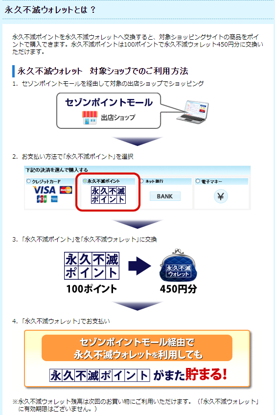 永久不滅ウォレットサービスは、セゾンカードを利用する中で取得できる「永久不滅ポイント」を使って買い物や資産運用などができるサービス。永久不滅ポイントは利用額1000円につき1ポイント付与され、有効期限がないのが特徴。