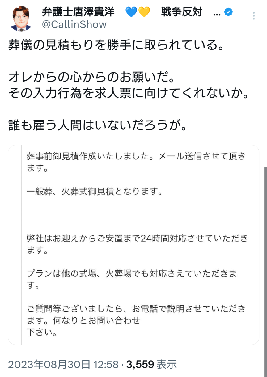 【悲報】唐澤弁護士、アンチに勝手に葬式を手配される