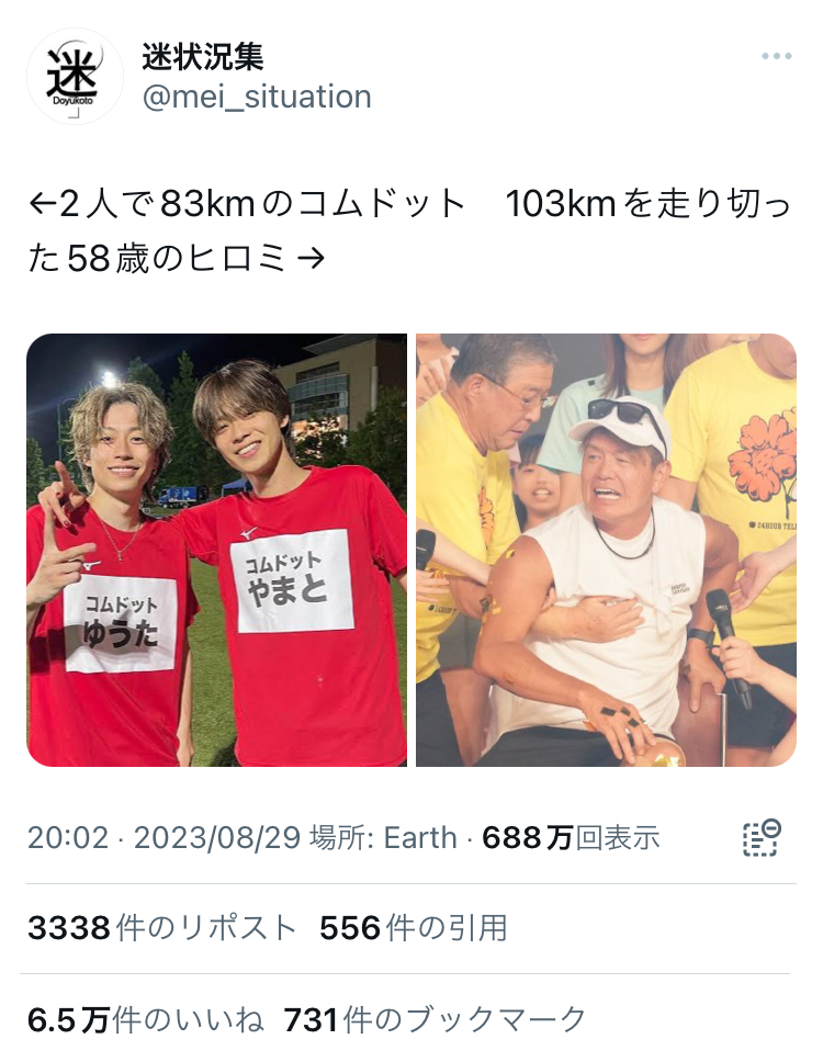 【悲報】YouTuberコムドットさん、2人合わせても58歳のヒロミに完敗 Twitter Facebook はてブ LINE コピー 2023.09.01 スポンサーリンク 1:2023/08/31(木) 22:20:21.90 ID:1UcKlE+Maダサ過ぎやろこいつら2:2023/08/31(木) 22:20:28.54 ID:1UcKlE+Ma3:2023/08/31(木) 22:20:35.84 ID:1UcKlE+Ma気合が足りんわ4:2023/08/31(木) 22:20:53.91 ID:1UcKlE+Maレペゼンですら100キロは走り切った転載元スレッド:https://nova.5ch.net/test/read.cgi/livegalileo/1693488021/ 続きを読む