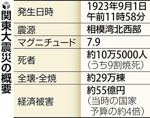 地震は、1923年9月1日午前11時58分、相模湾北西部で起き、首都圏は震度7や6強相当の揺れに見舞われた。東京や横浜では大規模火災が起き、死者・行方不明者の約9割が焼死。経済被害は、当時の国家予算の約4倍の約55億円に上った。