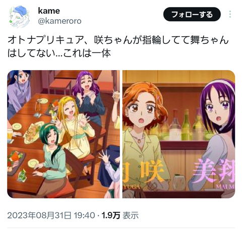 【悲報】オトナプリキュア、百合カップルの片割れが男と結婚して百合豚発狂wwwwwwwwwwww Twitter Facebook はてブ LINE コピー 2023.09.01 スポンサーリンク 1:それでも動く名無し:2023/09/01(金) 07:26:03.67 悲しいなぁ 左手薬指に指輪なし 左手薬指に指輪あり 5:それでも動く名無し:2023/09/01(金) 07:27:15.22 女の子が女の子と恋愛するなんて一時の流行り病みたいなものやったんやな 続きを読む