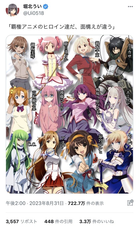 キモオタ「歴代覇権アニメのヒロイン達だ。面構えが違う」 (※画像あり) Twitter Facebook はてブ LINE コピー 2023.09.02 スポンサーリンク 1:それでも動く名無し:2023/09/01(金) 15:15:18.10 2:それでも動く名無し:2023/09/01(金) 15:15:45.52 ヒロインはインデックスだが? 19:それでも動く名無し:2023/09/01(金) 15:23:13.81 >>2 超電磁砲のほうだろ 続きを読む