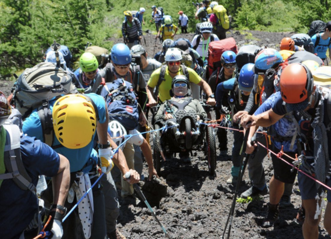 ごろ、山頂に到達した。不自由な脚をカバーする山岳用車いすを家族や仲間らがサポート。前日には名誉校長を務め