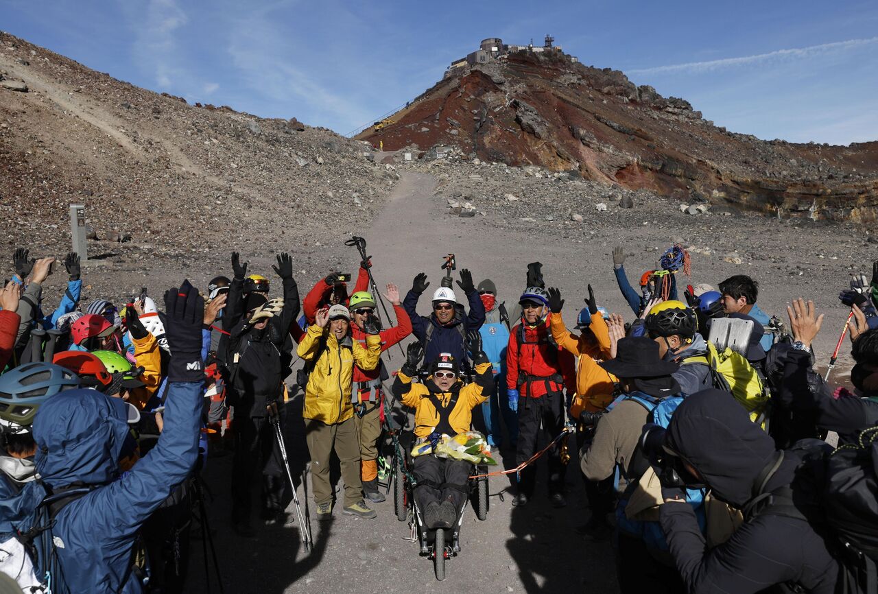 90歳三浦さん、富士山頂に到達 不自由な脚、仲間が車いす支援