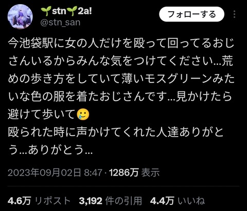 【悲報】街で女性だけを殴り回る弱者男性が発生中の模様WWWWWWWWWWWWWWWWWWWWWWWWWWWWWWWWWWWWWWWWWWWWWWWWWWW Twitter Facebook はてブ LINE コピー 2023.09.03 スポンサーリンク 1:以下、5ちゃんねるからVIPがお送りします:2023/09/03(日) 16:46:41.996 ID:PXlmPaX/r 2:以下、5ちゃんねるからVIPがお送りします:2023/09/03(日) 16:47:07.484 ID:QBqtX+rbd ワロタ 4:以下、5ちゃんねるからVIPがお送りします:2023/09/03(日) 16:48:23.151 ID:cALQBezj0 ネット社会の闇 男コミュニティで褒めて貰えるんだろな 5:以下、5ちゃんねるからVIPがお送りします:2023/09/03(日) 16:49:49.043 ID:f/nzD1NN0 レアモンスターイベント来たな 続きを読む