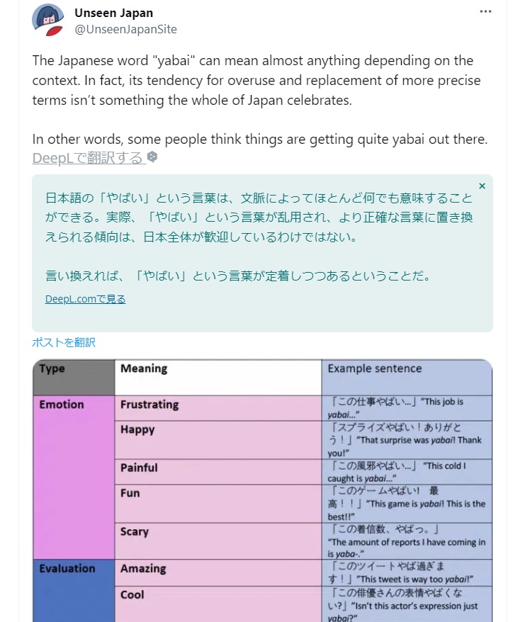 1990年代からは「凄い」「最高」の意味でも使われるようになり、現代では、肯定・否定問わず用いられるだけでなく、意味なく発する言葉として「やばい」が用いられるようになった。