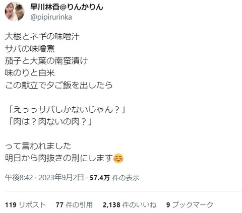 【追悼】男さん、晩飯にサバを出され文句を言ってしまう Twitter Facebook はてブ LINE コピー 2023.09.05 スポンサーリンク 1:それでも動く名無し:2023/09/04(月) 17:25:35.03 ID:vnipPmF50 2:それでも動く名無し:2023/09/04(月) 17:26:22.11 ID:B39NmZ410 まあサバって朝ごはんのイメージやしね 3:それでも動く名無し:2023/09/04(月) 17:26:42.71 ID:l+/kUK5ga ワイのお嫁さんになって欲しい 4:それでも動く名無し:2023/09/04(月) 17:27:20.45 ID:gkr+lb0Ga 米抜きの刑じゃなくて良かったな 続きを読む
