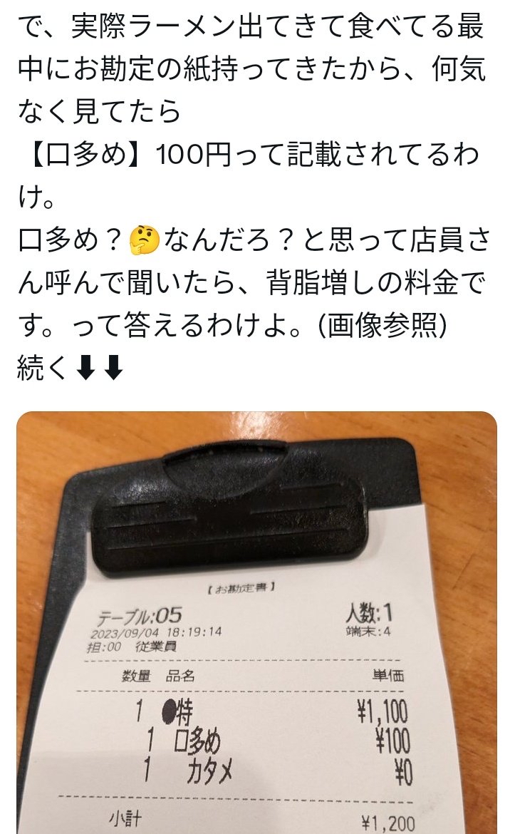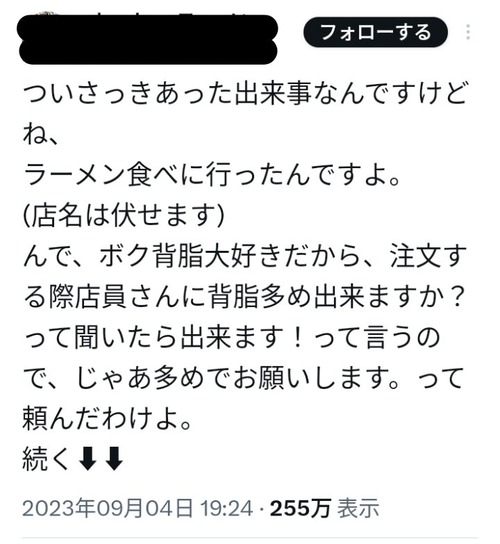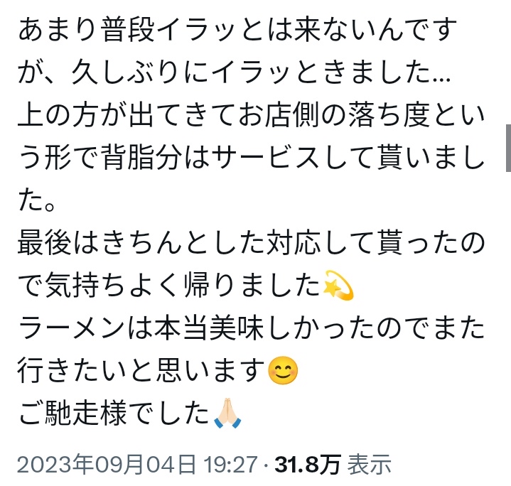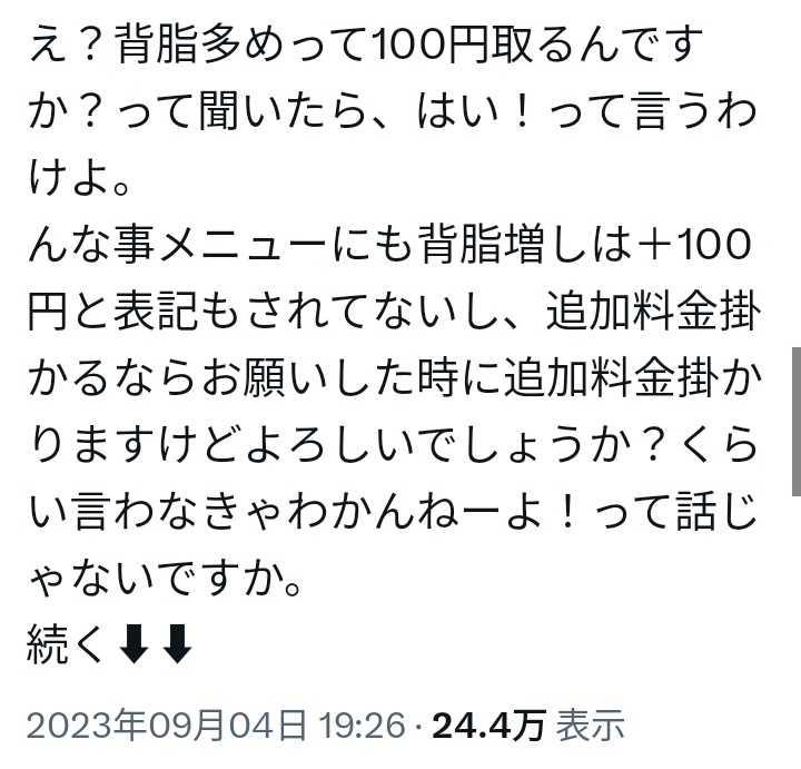 客「ラーメン背脂多めで!」店長「ほいよ+100円ね」 客「は?どこにも書いてねーじゃねえか!」 Twitter Facebook はてブ LINE コピー 2023.09.06 スポンサーリンク 1: それでも動く名無し 2023/09/06(水) 09:32:02.48 ID:R7lN+yDSp 5: それでも動く名無し 2023/09/06(水) 09:34:17.65 ID:c0QZfdOo0 また行きますってなるのが信じられない 恥ずかしくて行けない 6: それでも動く名無し 2023/09/06(水) 09:34:53.82 ID:b9Kz0TjI0 対応してもらったのに気が晴れなくて草 続きを読む