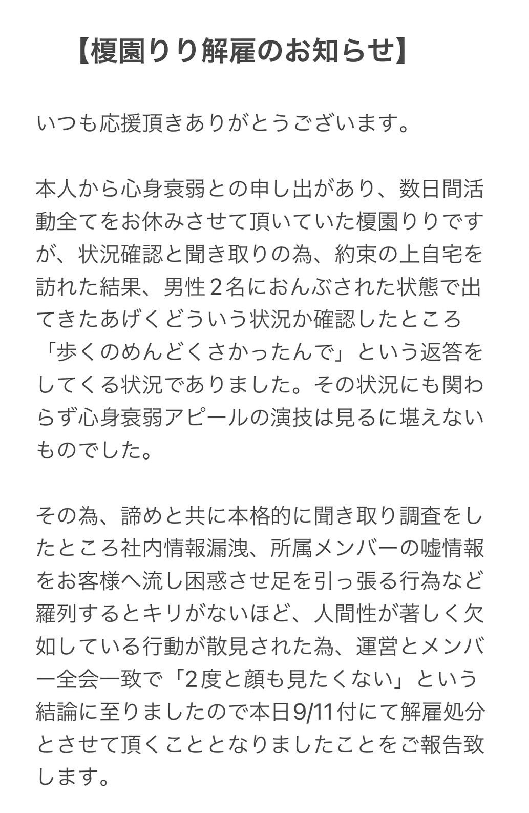 「人間性が著しく欠如している行動が散見された為、運営とメンバー全会一致で『2度と顔も見たくない』という結論に至りました」と強く非難した上で、11日付けで解雇処分としたと伝えました。