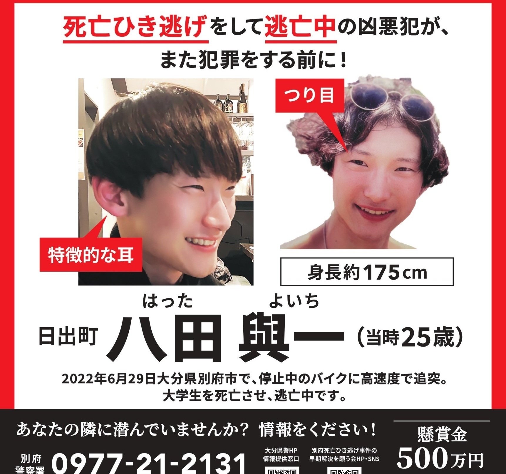 八田容疑者は去年6月29日、別府市野口原の県道の交差点で、大学生2人を車ではねて、このうち当時19歳の大学生を死亡させ現場から立ち去ったとして、ひき逃げの疑いで逮捕状が出され、全国に指名手配されています。
