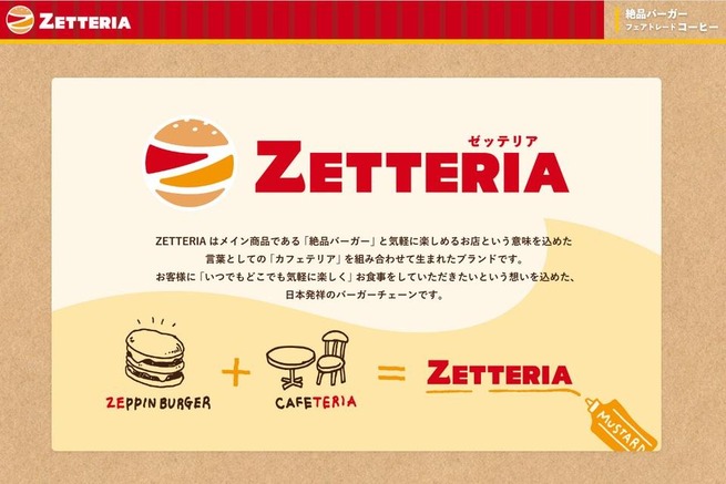 ZETTERIAはメイン商品である「絶品バーガー」と、気軽に楽しめるお店という意味を込めた言葉としての「カフェテリア」を組み合わせて生まれたブランド。「いつでもどこでも気軽に楽しく」食事をしてもらいたいという想いが込められている。