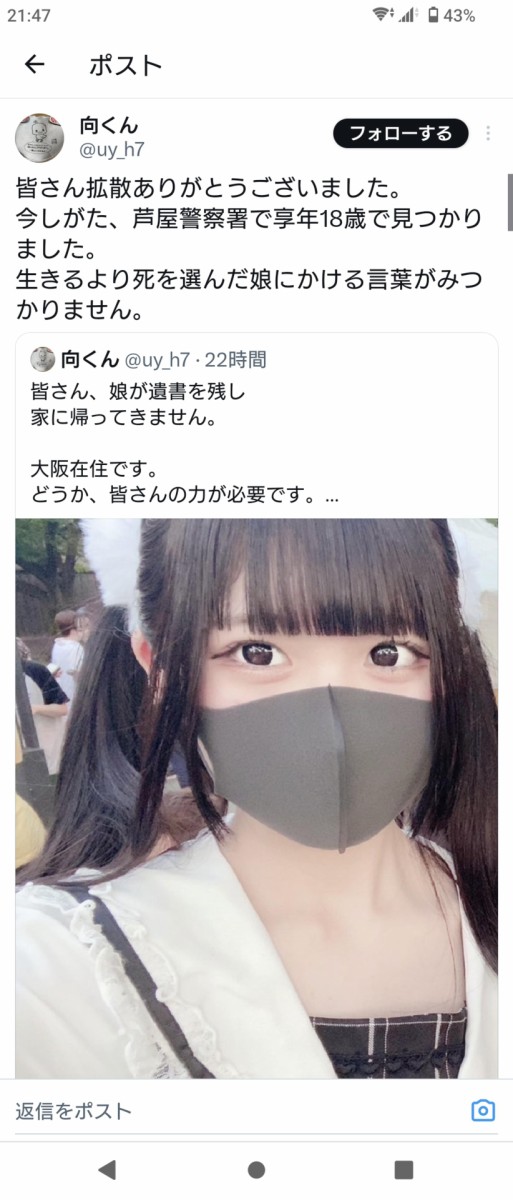 【画像】芦屋で飛び降り自殺しちゃったJKめちゃくちゃかわいいと話題に… Twitter Facebook はてブ LINE コピー 2023.09.20 スポンサーリンク 1:以下、?ちゃんねるからVIPがお送りします:2023/09/19(火) 22:44:42.198 こんな可愛くても死にたいんだなぁ 3:以下、?ちゃんねるからVIPがお送りします:2023/09/19(火) 22:46:02.081 二人で飛び降りた子? 6:以下、?ちゃんねるからVIPがお送りします:2023/09/19(火) 22:47:33.506 >>3 そう 遺書もあったらしい 続きを読む