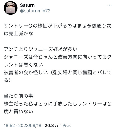 ジャニオタ「ジャニーズに喧嘩売ったサントリーさん、株価が下がり終わる」←これwwwwwwwwwwww Twitter Facebook はてブ LINE コピー 2023.09.21 スポンサーリンク 1:それでも動く名無し:2023/09/21(木) 00:31:18.73 ID:9CR6oxq30 3:それでも動く名無し:2023/09/21(木) 00:32:08.53 ID:uOtjrPmsr 上場してたっけ? 5:それでも動く名無し:2023/09/21(木) 00:32:19.60 ID:kiqgzy7y0 非上場 9:それでも動く名無し:2023/09/21(木) 00:33:23.12 ID:cQmc95XS0 ソースは妄想 続きを読む